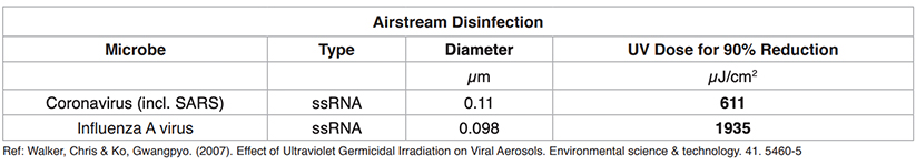 Dosages for a 90% kill of most bacteria and viruses is universally regarded as greater than 2,000 μW·s/cm2.