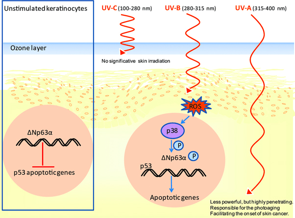 Aftermath of ultraviolet A-B-C radiation on skin. UV-C are shielded by the atmosphere and do not reach the skin. UV-B get through the epidermis causing ROS formation (release), activation of p38 with consequent ΔNp63 detachment and leading to activation of p53 apoptotic genes. On the contrary, ΔNp63 leads a suppressive activity on p53 apoptotic function in unstimulated keratinocytes. UV-A is responsible for skin aging.